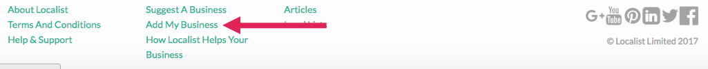 Click the link called "Add My Business" which you will find at the bottom every page on the localist site (in the footer)