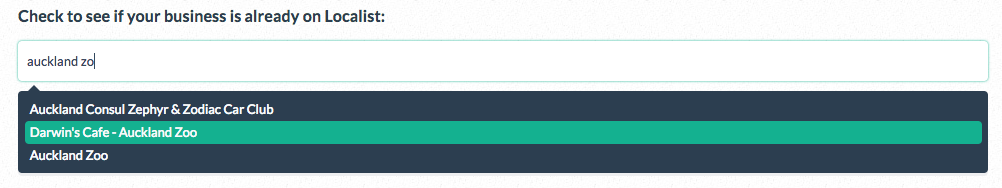 As you start typing your business name, any matching businesses from our database will be displayed. If your business already exists, choose it from the list and follow the instructions.